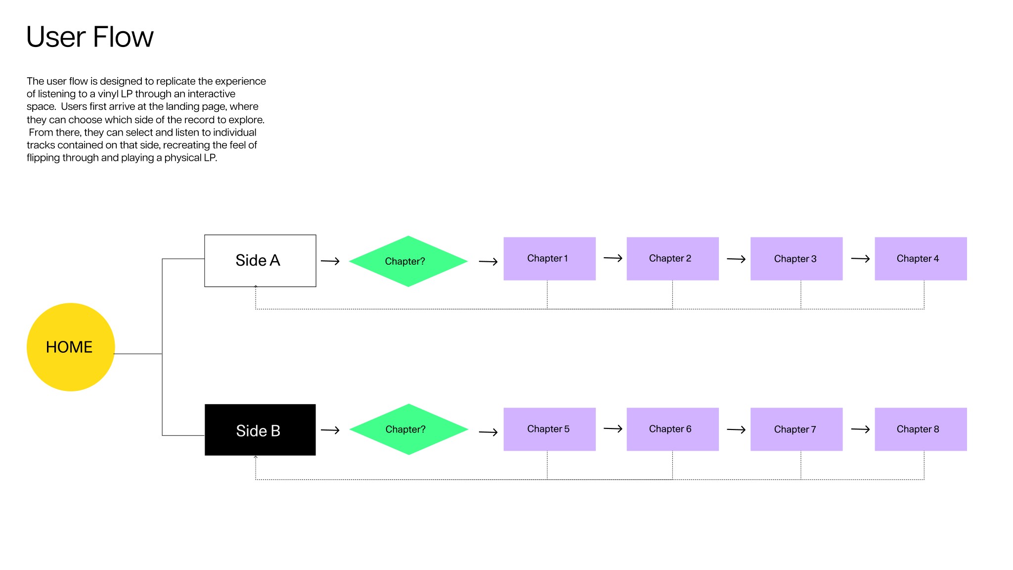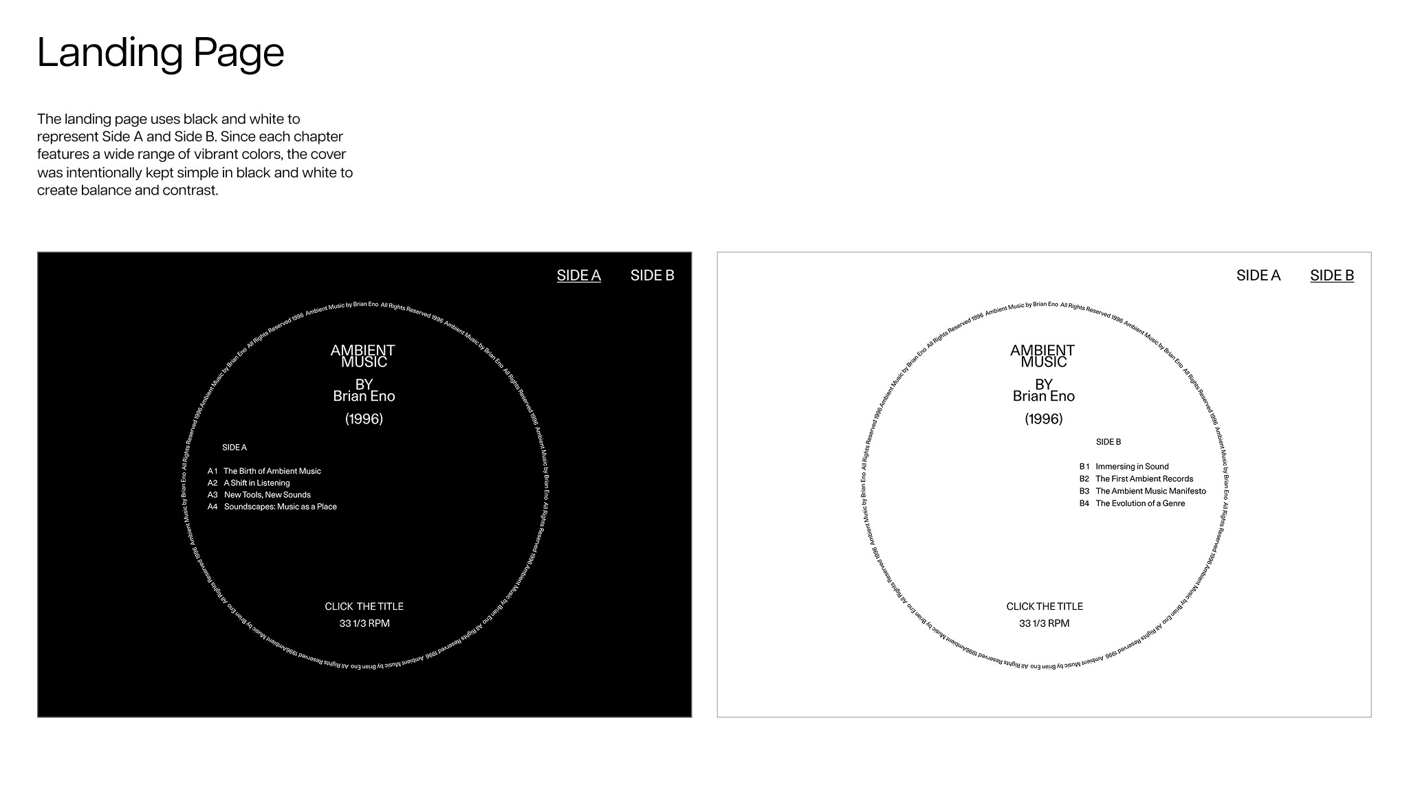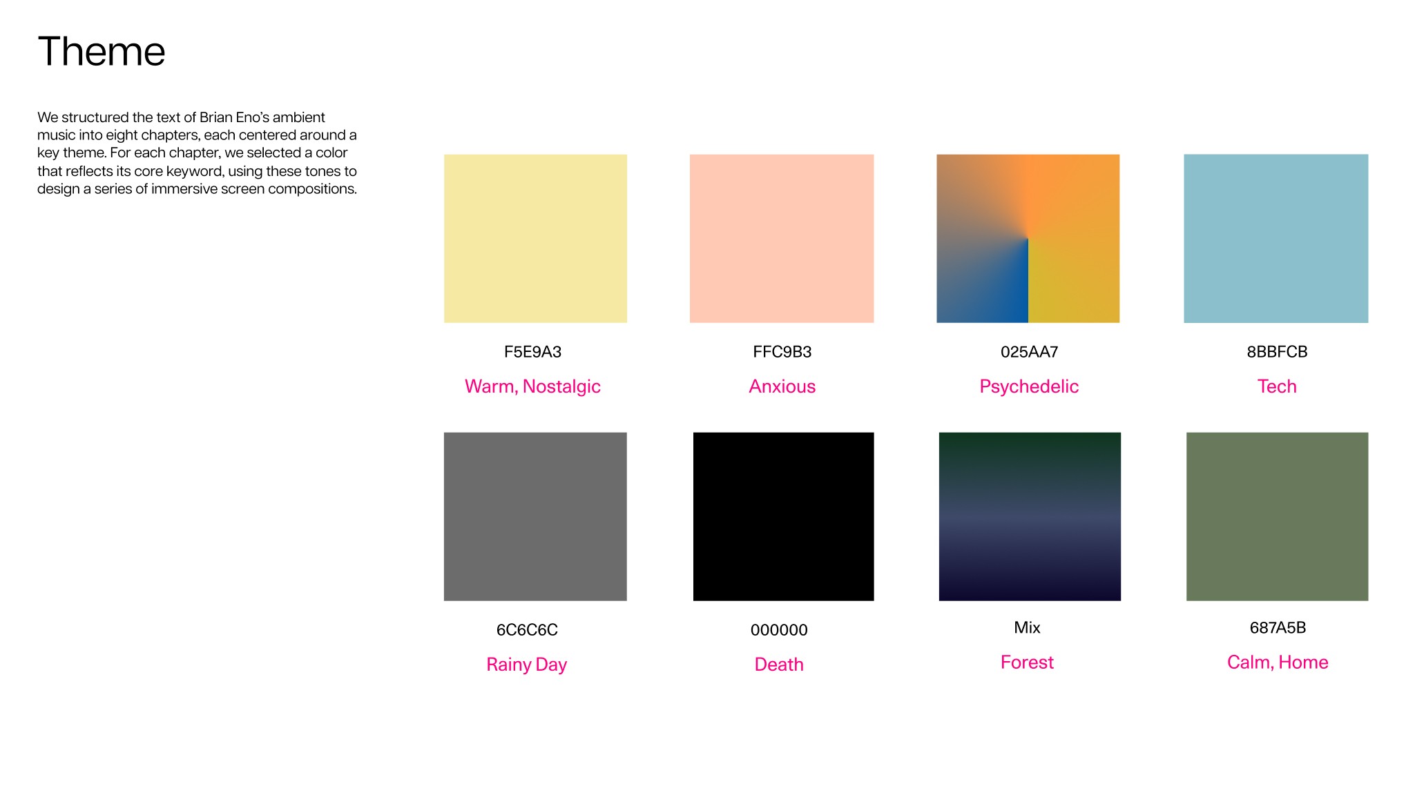 The Ambient Music project combines the content of Brian Eno’s essay “Ambient Music” with his music to create an interactive space composed solely of text. This project is designed for both mobile and desktop platforms, offering a unique, immersive experience through typographic expression alone.