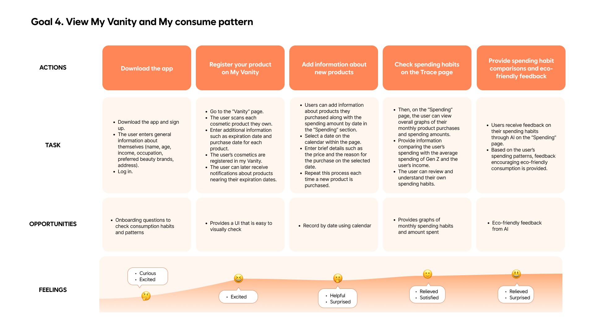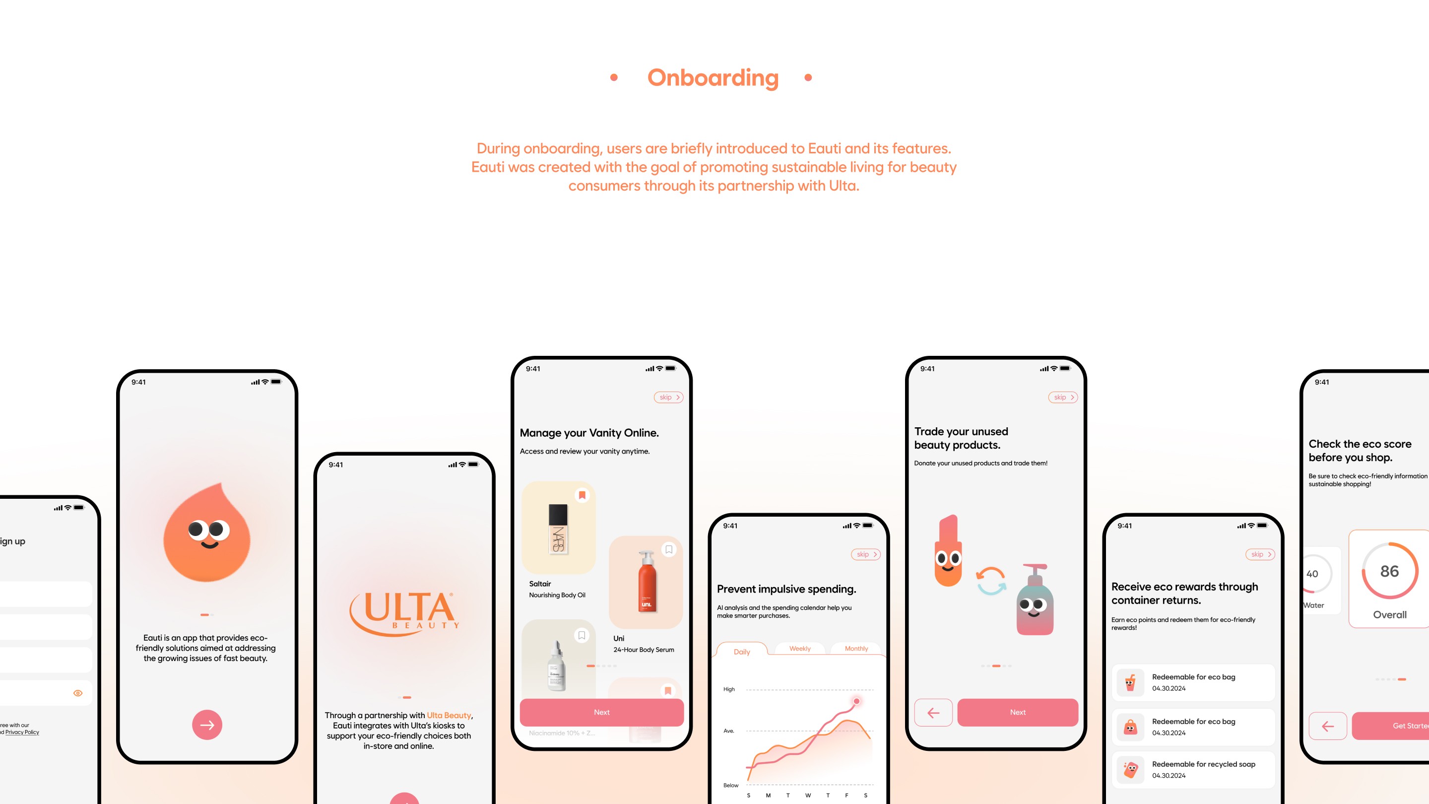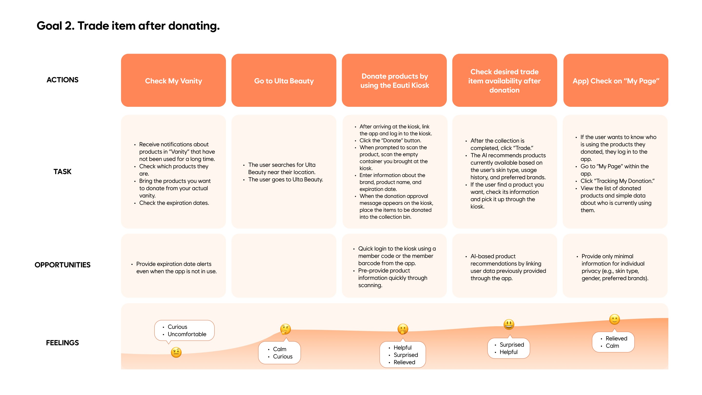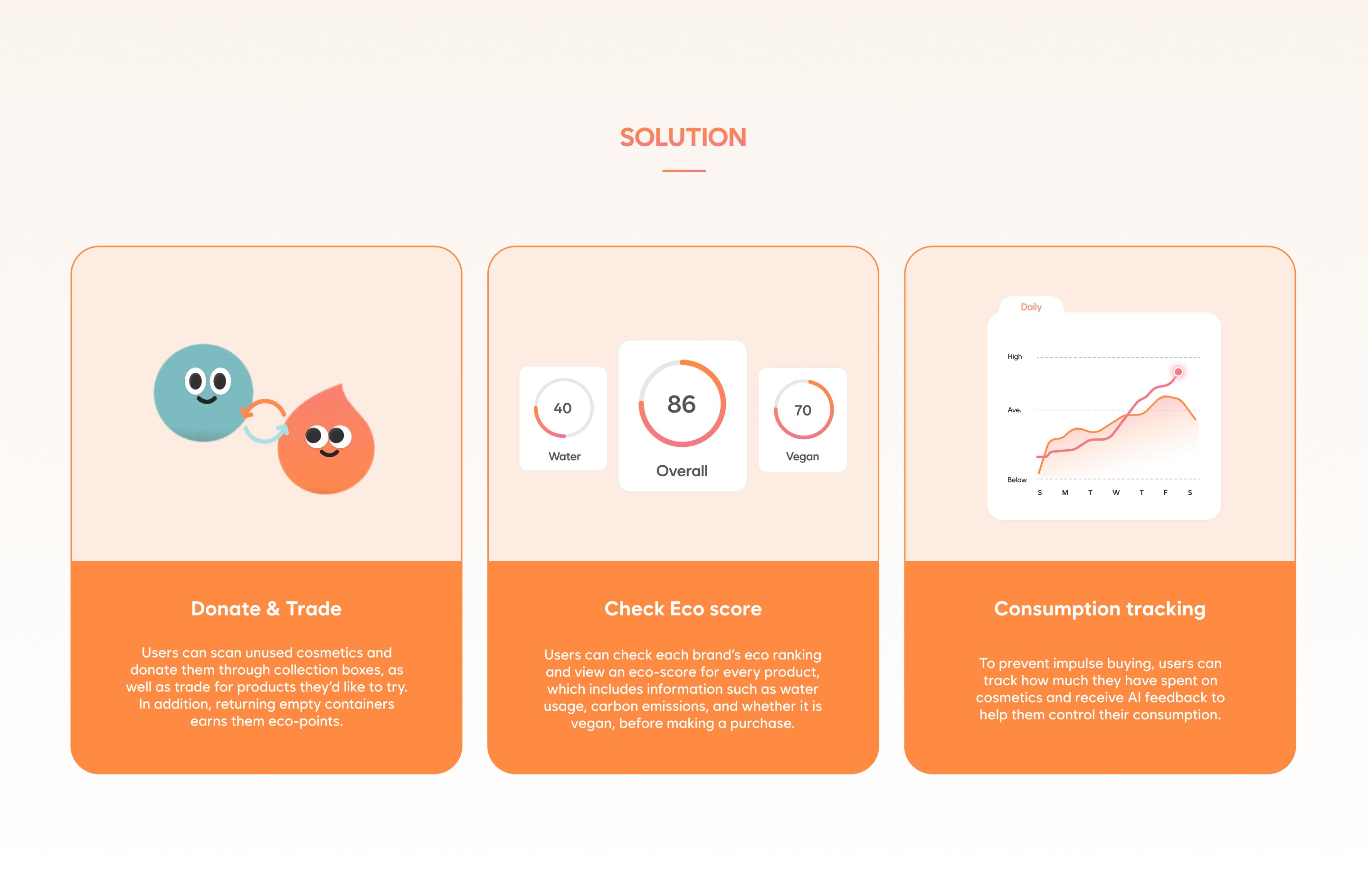 Eauti is an app designed to help beauty product users curb overconsumption and impulsive purchases driven by fast beauty trends. It encourages eco-friendly purchasing habits and transforms the guilt of having unused cosmetics piling up into a sense of pride through initiatives such as donations, product trades, and empty-container recycling. Ultimately, Eauti empowers users to embrace a more sustainable lifestyle.