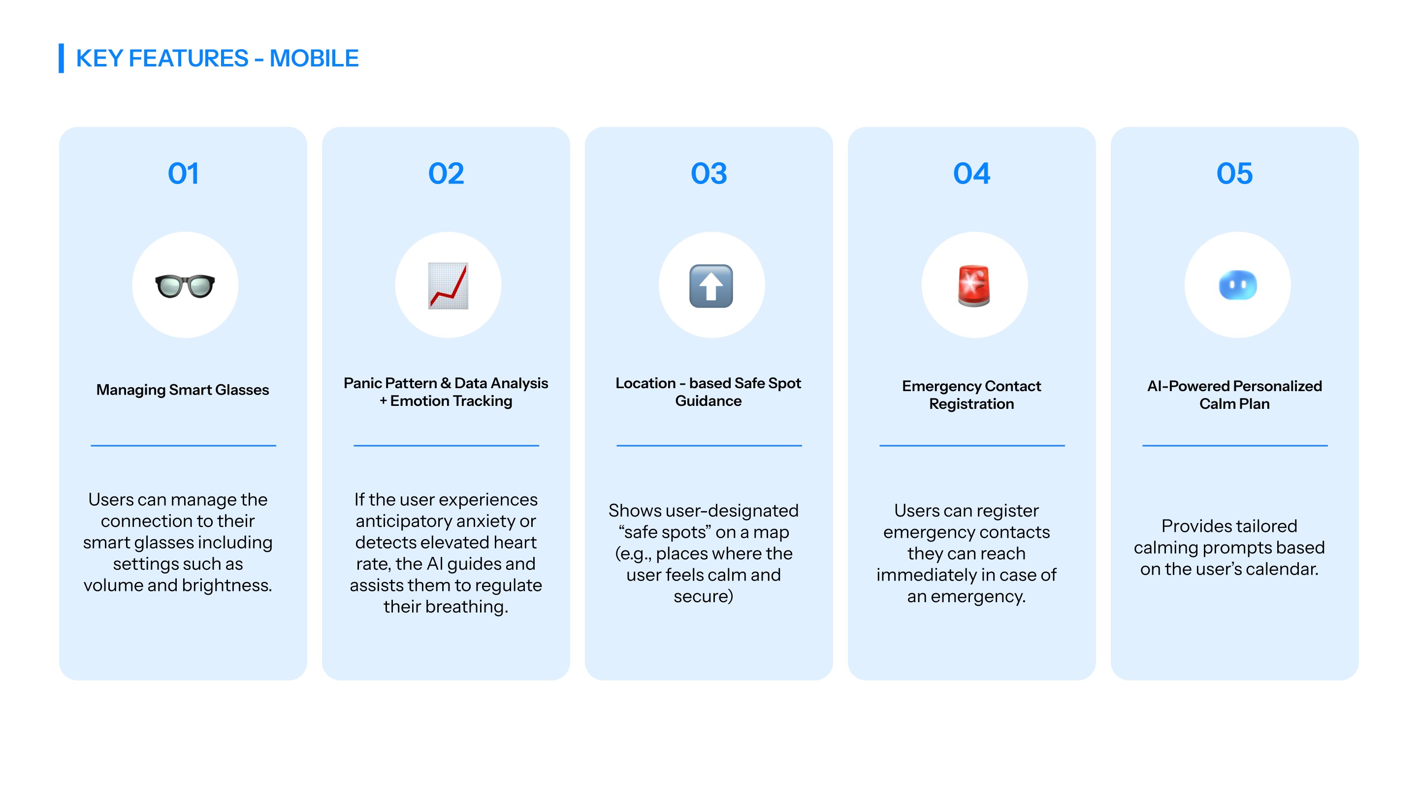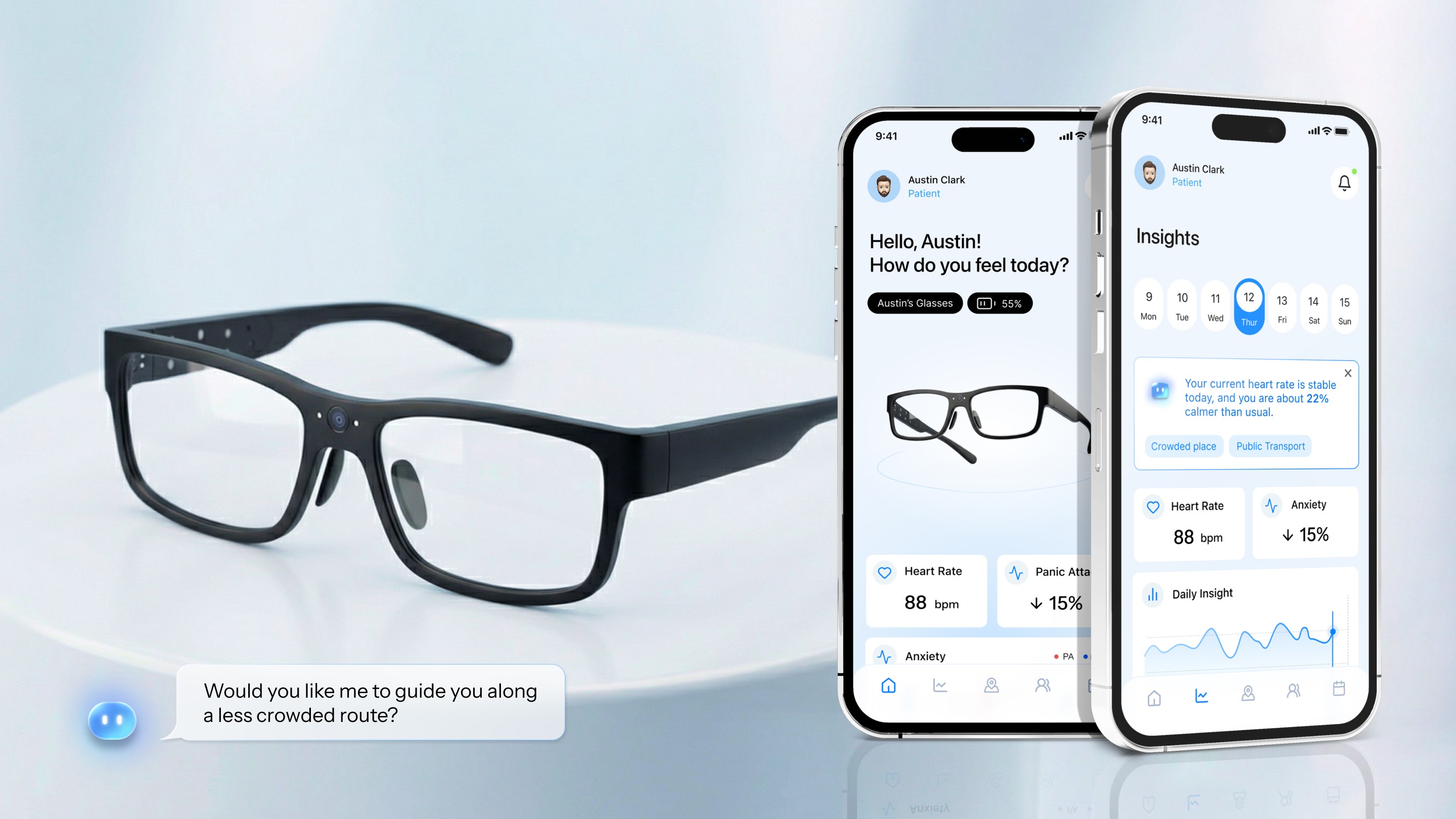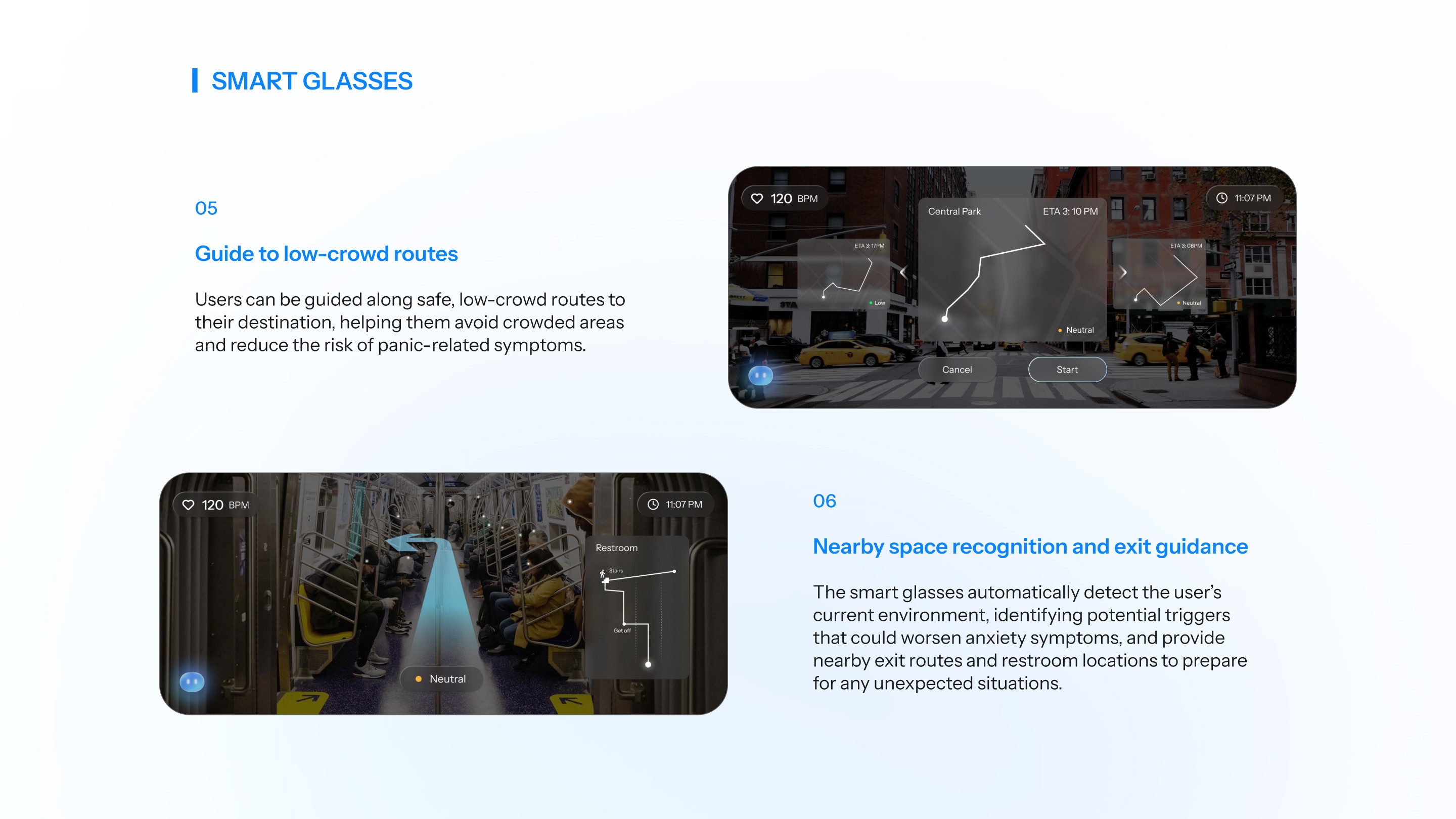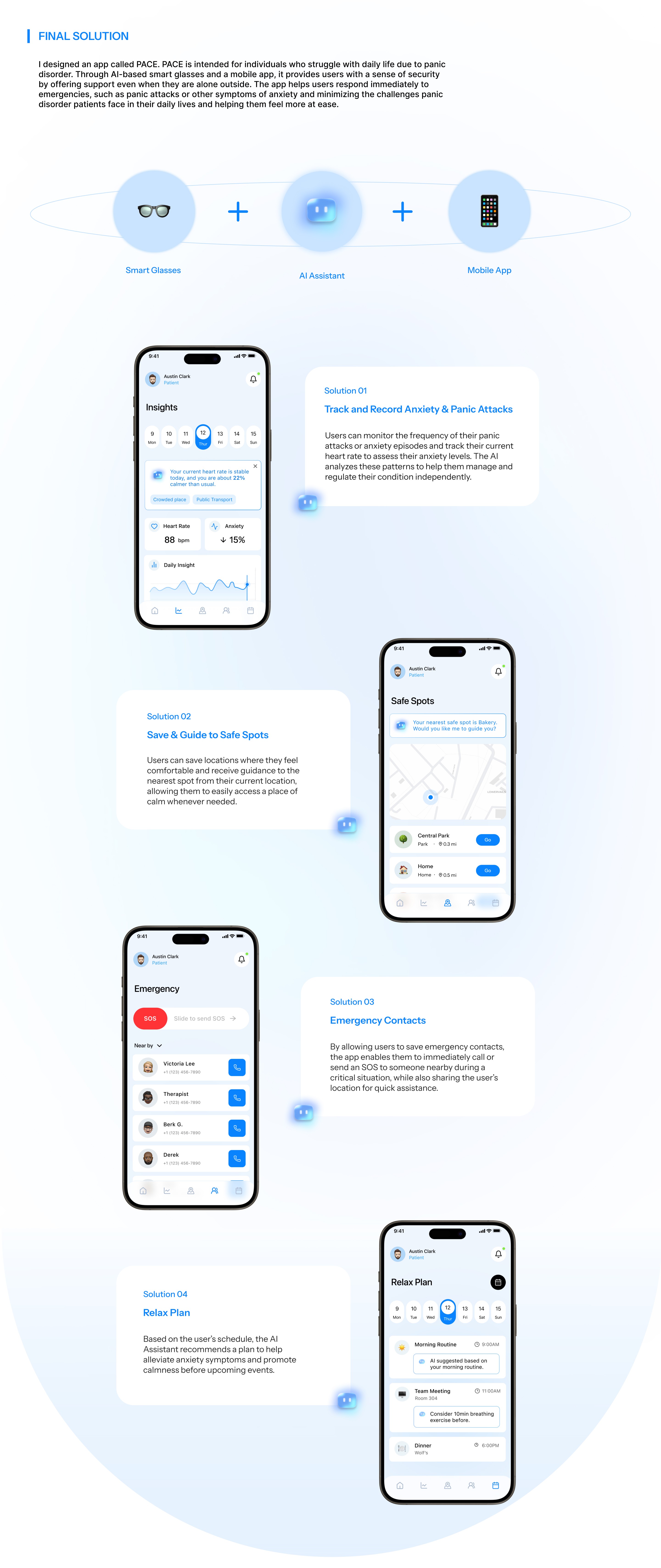 PACE is an app designed for individuals experiencing panic disorder, helping users who often face significant limitations in their daily lives. By integrating smart glasses with a mobile app, PACE uses an AI assistant to support users in managing their symptoms and identifying behavioral or emotional patterns. Through real-time guidance and immediate assistance provided by AI, the app enhances users’ ability to navigate daily situations with greater stability and confidence.