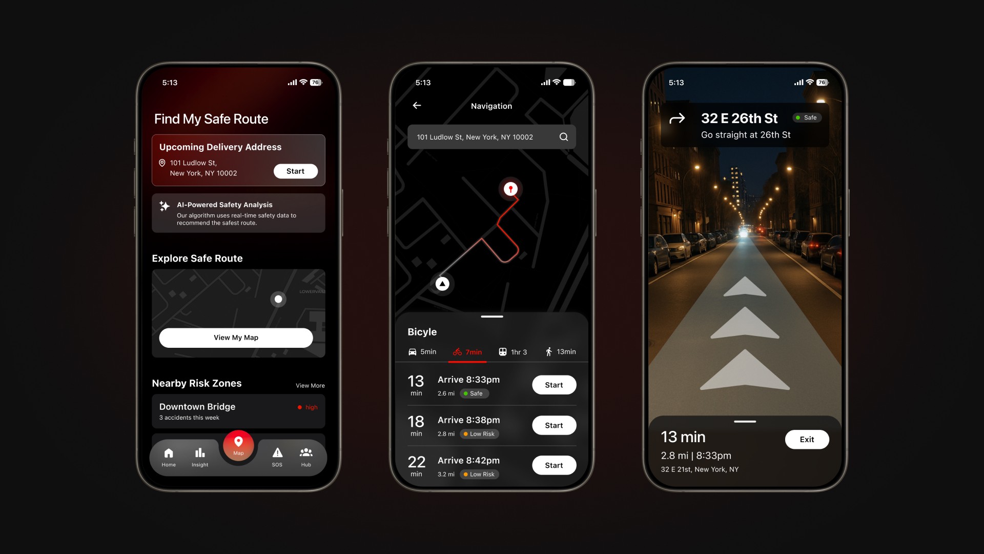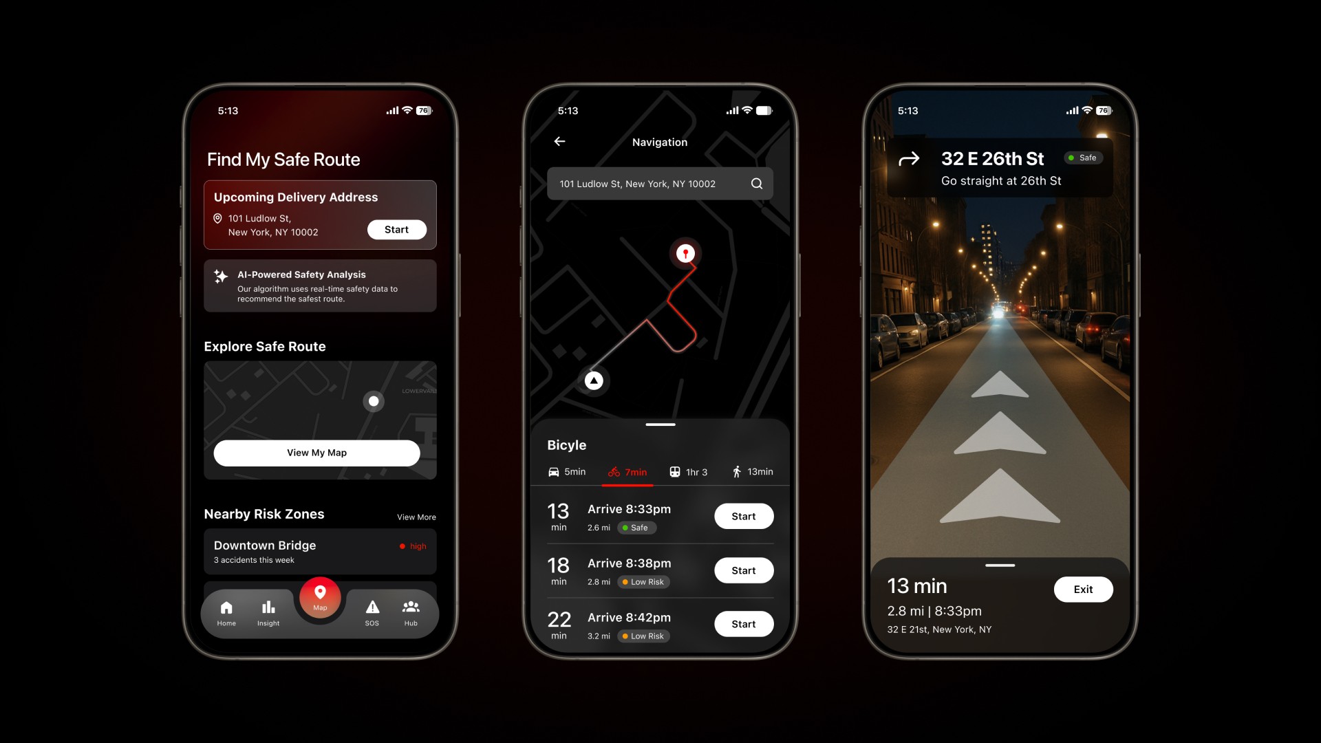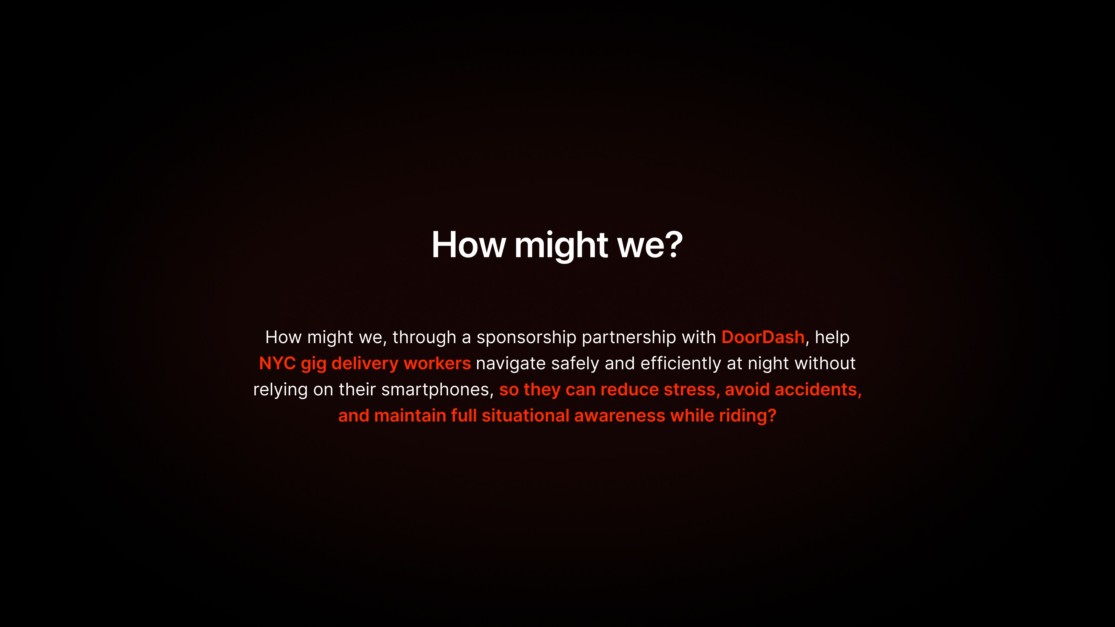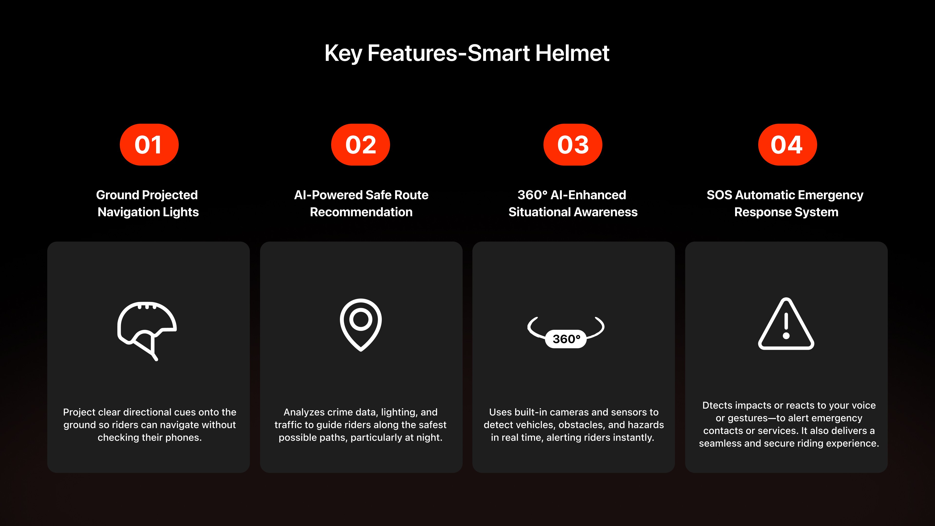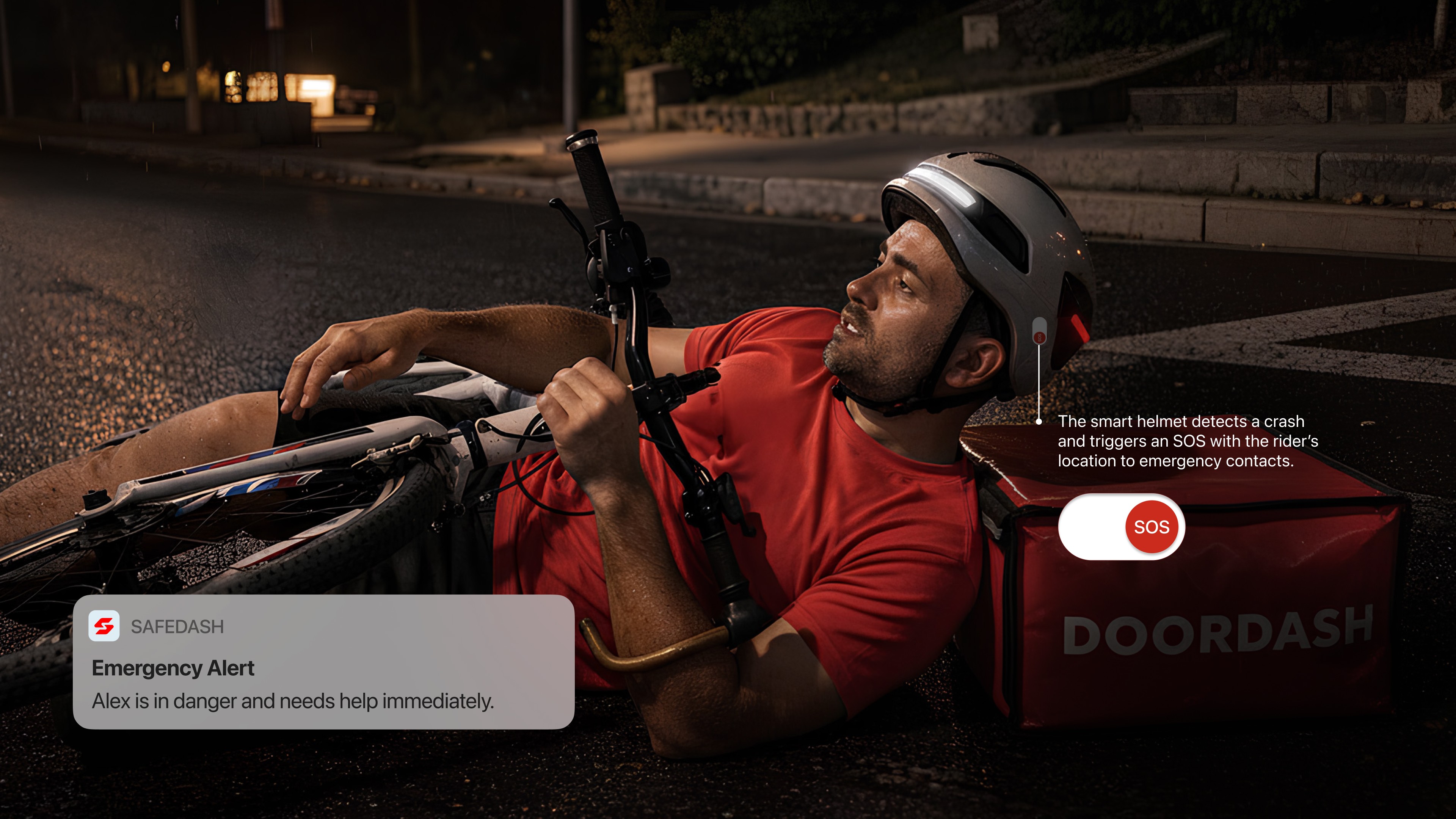 Safedash proposes an autopilot-style smart helmet that uses ground-projected navigation lights, audio cues, and AI to reduce smartphone dependence and help gig workers stay safer during nighttime deliveries.